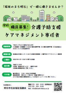 採用情報 2025/10/10 介護予防支援ケアマネジメント専任者(契約職員)を募集します!~令和8年4月1日までの間で随時採用~ <試験日> 随時実施します(日時については応相談) <募集要項> 募集要項は下記(画像をクリック)からダウンロードしてください。 <申込時必要書類> ・提出書類チェックシート PDF ・申込書①② 申込書①Excel / 申込書②Excel / 申込書①PDF / 申込書②PDF ・職務経験報告書 Excel / PDF ・受験票 Excel / PDF ※その他の提出書類については提出書類チェックシートをご覧ください。 お知らせトップへ戻る
